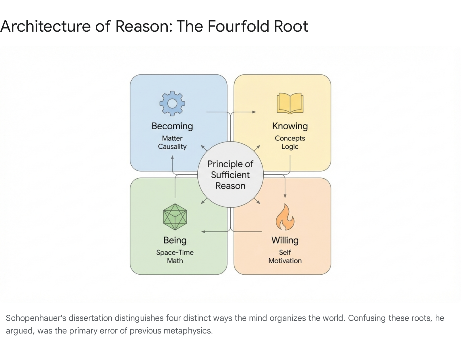 The Principle of Sufficient Reason (PSR) states that "nothing is without a reason for being rather than not being." Schopenhauer identifies four distinct "roots" of this principle, corresponding to four distinct classes of objects for the subject. This classification is not just academic; it is the map of the human mind's interaction with the world.