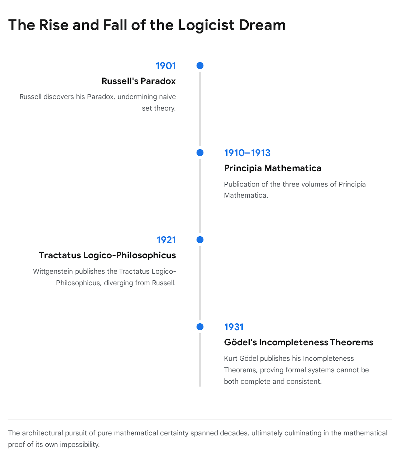 The ultimate death blow to the logicist dream of a complete, unassailable, and perfect formal system arrived decades later, firmly closing the door that Russell's Paradox had opened. In 1931, the Austrian logician Kurt Gödel published his First and Second Incompleteness Theorems, fundamentally altering the landscape of modern logic.
