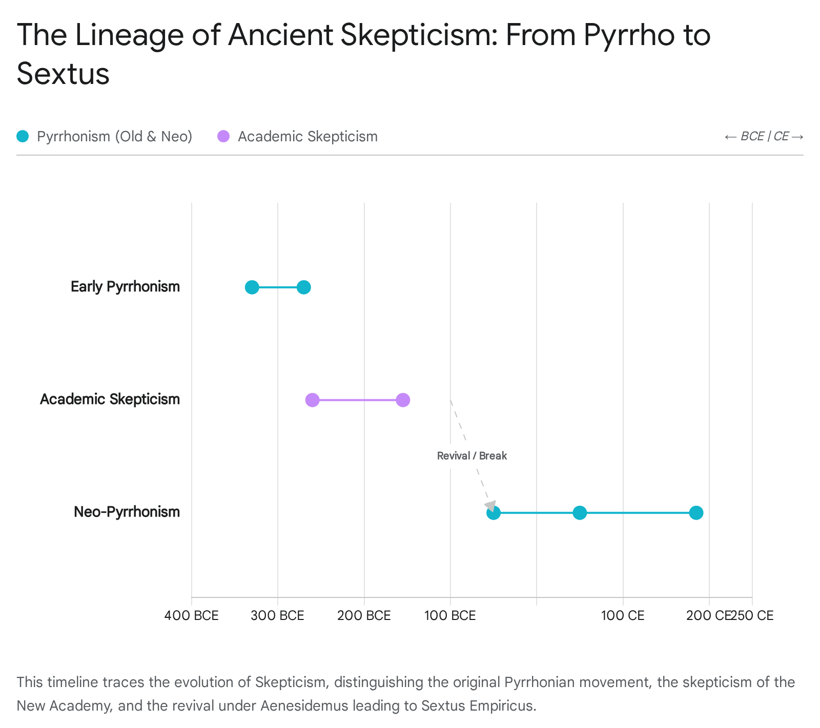 Sextus devotes significant energy to distinguishing Pyrrhonism from the "New Academy" (the skeptical phase of Plato's Academy). This distinction is vital for his claim to philosophical purity.