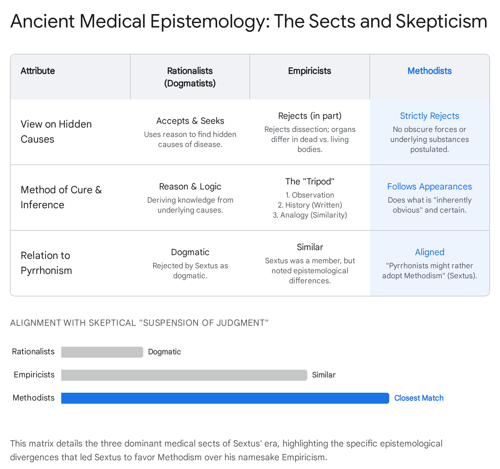 However, a careful reading of Outlines of Pyrrhonism (PH I 236–241) reveals a startling divergence: Sextus explicitly distances the skeptical philosophy from the Empiric medical sect. He argues that the Empiricists, in their zealous rejection of hidden causes, inadvertently slide into a form of "negative dogmatism." By asserting that hidden causes are knowable as unknowable or by affirming their non-existence, the Empiricist makes a positive claim about the nature of reality.