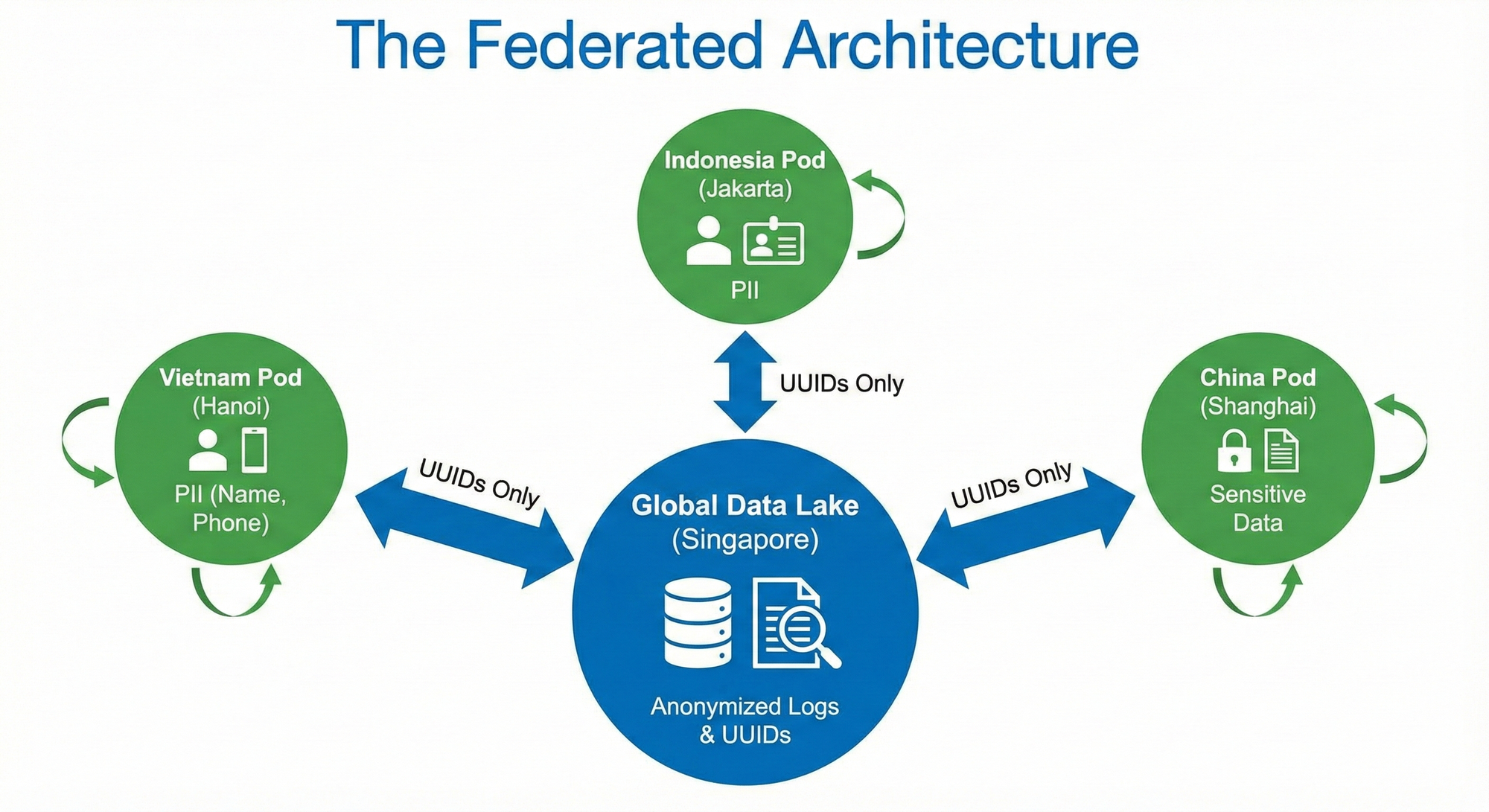 - Local PII Stores: You deploy lightweight "Data Residency Pods" in restricted countries (e.g., a local SQL instance in Hanoi, a local instance in Jakarta). These store only the PII (Name, Phone, ID) to satisfy local storage laws.